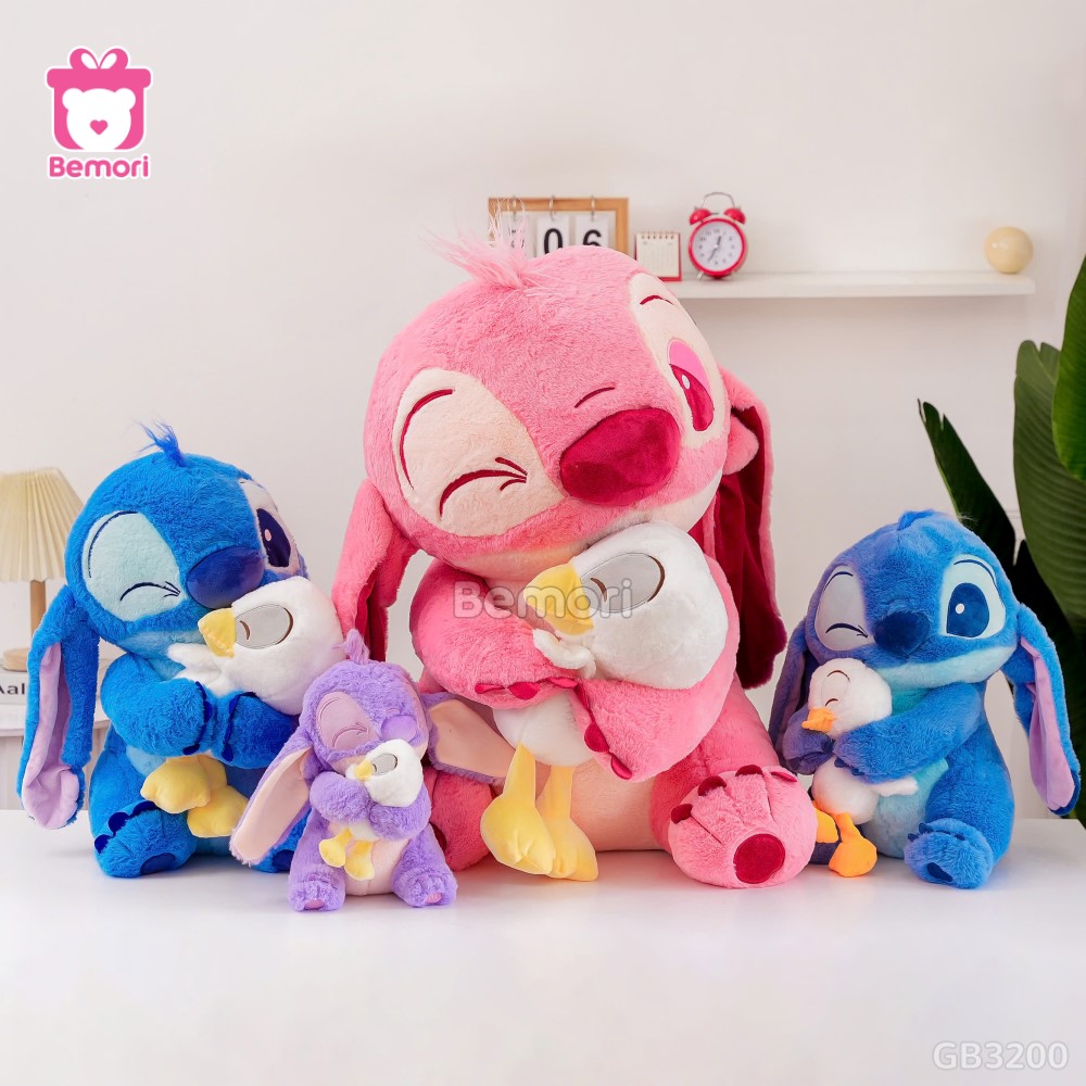 - Thiết kế: Stitch với đôi tai dài, mắt to, ôm một chú vịt nhỏ màu trắng hoặc vàng. Có 3 màu: xanh, hồng, tím.