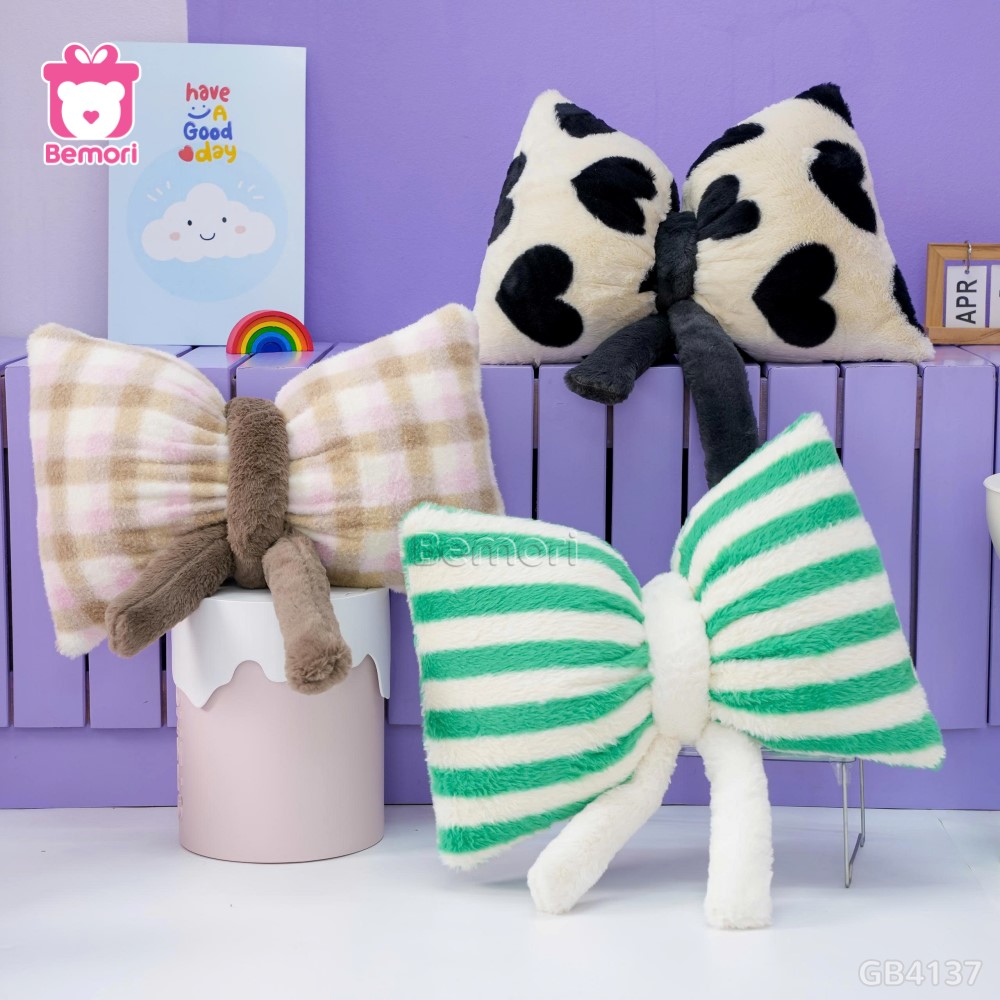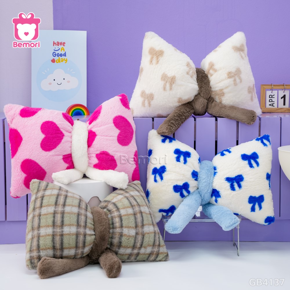 Đây là một mẫu gối tựa lưng hoặc gối ôm được thiết kế hình nơ xinh xắn, rất phù hợp để trang trí phòng ngủ, phòng khách hoặc làm quà tặng.