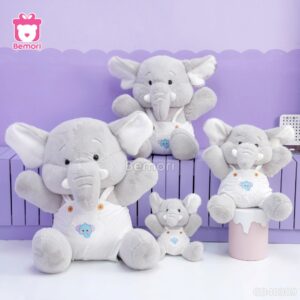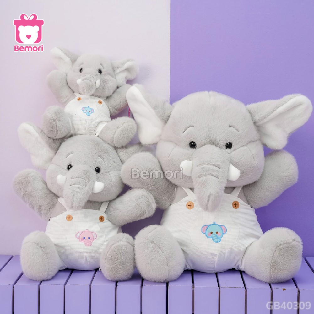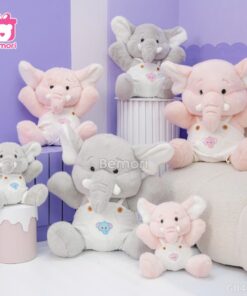 - Thiết kế: Voi có tai to, mũi dài, mặc yếm màu hồng hoặc xám, tạo cảm giác hiền lành và dễ thương.